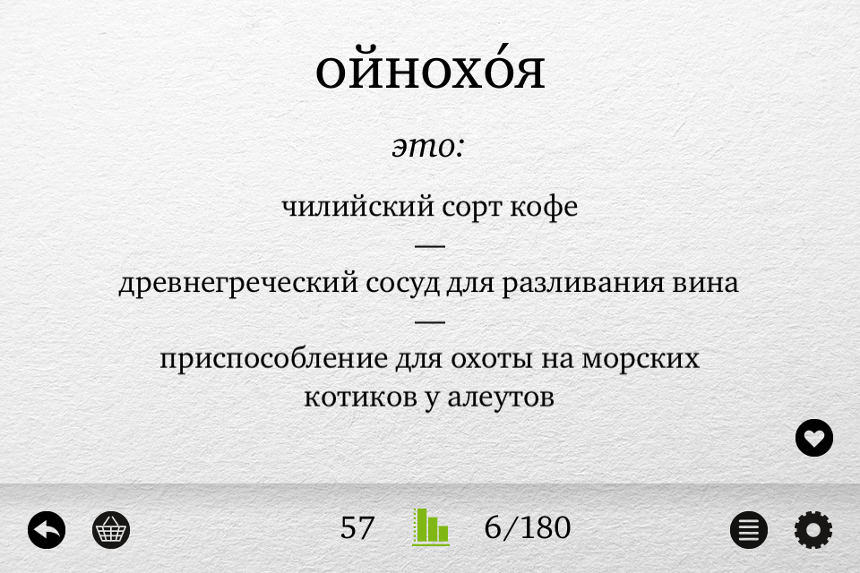 Требования iOS: 6.0 или более поздняя, 19.1 МБ свободного места. Подходит для: iPhone, iPad и iPod touch. Приложение на русском языке. Возраст 4+ Кратко Игра представляет собой набор из 120 карточек. На каждой карточке приведено редкое слово русского языка и три варианта его возможных значений, из которых только один правильный. Необходимо догадаться, какой именно, и, нажав на него, проверить себя.