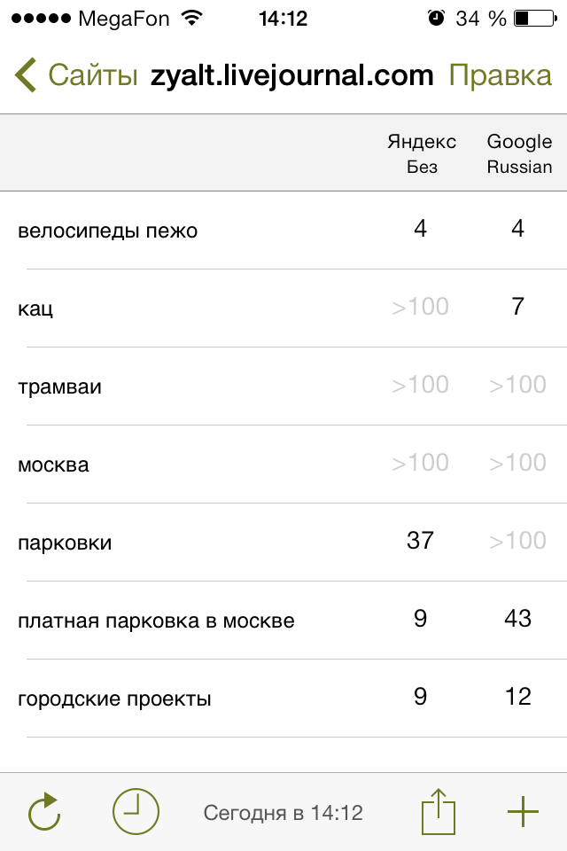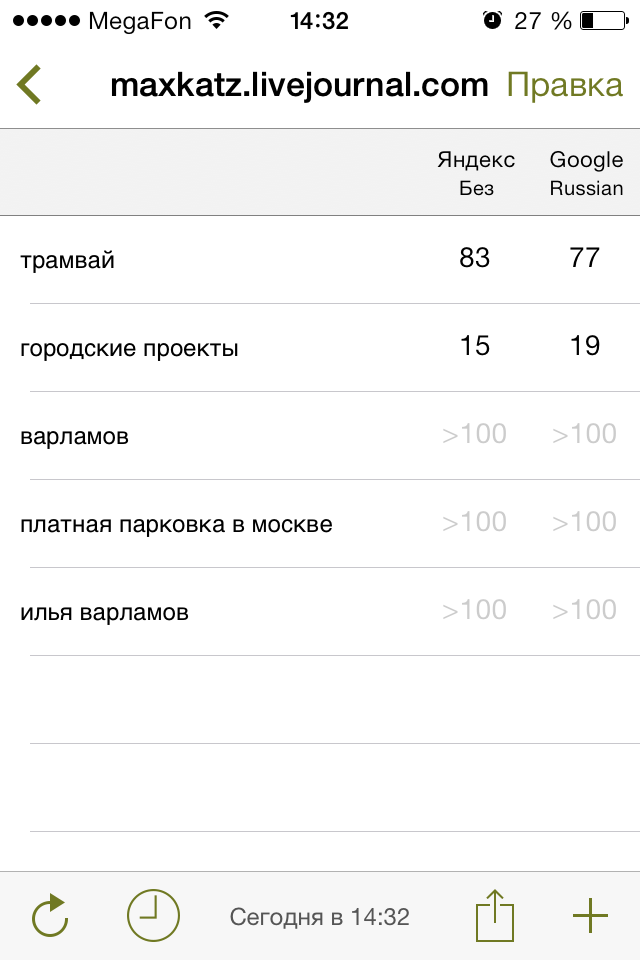 Что мы видим? Если люди ищут велосипеды пежо, то они наверняка попадут в ЖЖ Варламова. Такая же беда с Кацем. Правда только в google, Яндекс не очень любит Илью и Максима. Довольно интересные позиции по запросу «платные парковки в Москве». Блог Ильи входит в ТОП 10. Если «тапнуть» по циферке, то можно посмотреть, кого яндекс выдает выше. На примере велосипедов Пежо…