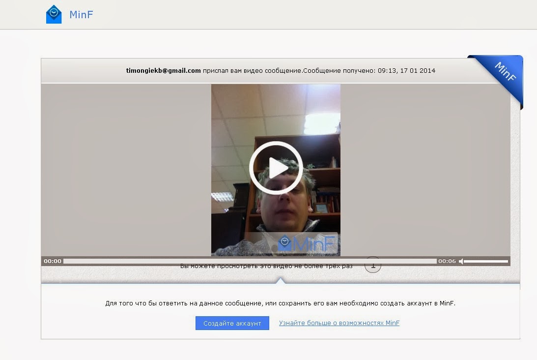 Достаточно забавная вещица. По заявлением разработчиков, MinF хранит данные до 100 лет, а это значит, что можно отправить послание своим дальним родственникам. Правда есть маленький нюанс, откуда я знаю e-mail адрес моих потомков? Решением проблемы могла быть ссылка, которая распечатывается на красивом бланке, с хорошим текстом: Дорогие потомки! Я записал свое обращение, которое вы сможете посмотреть в 2050 году! Доступ к видео будет открыт 31 декабря в 23-55! Ну или найти другое решение.