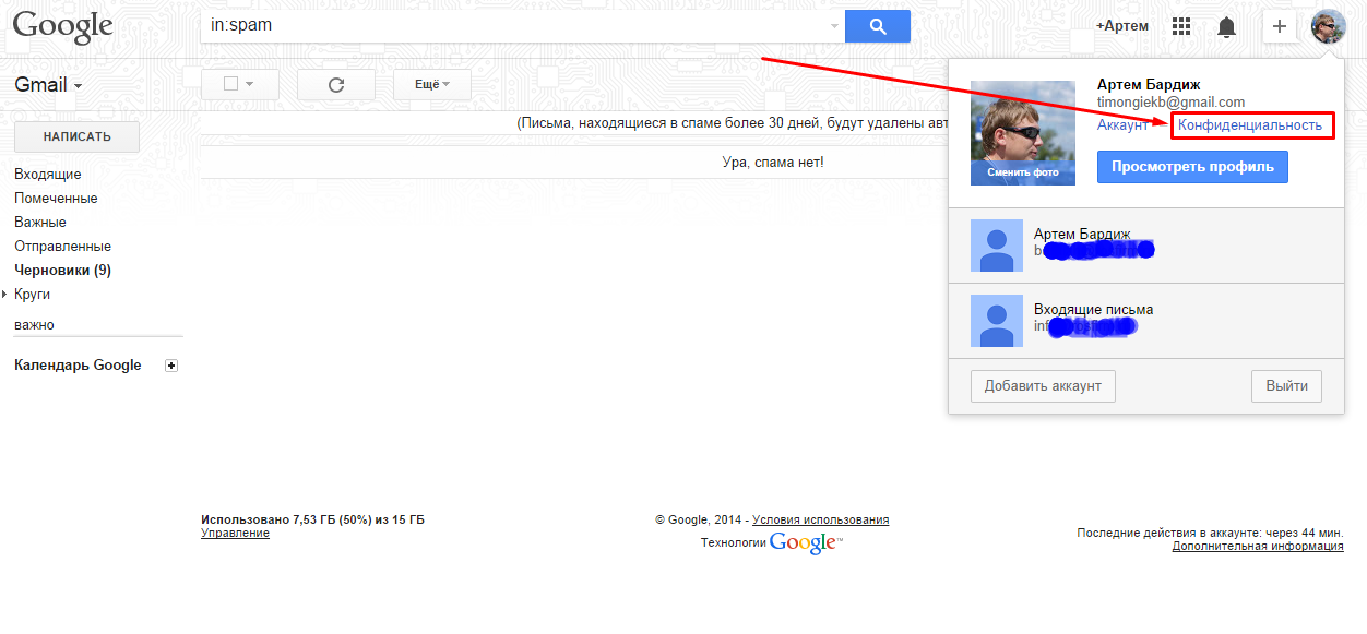 Настраивается все очень легко. Нужно зайти в раздел «Конфиденциальность». Чтобы туда попасть, нужно щелкнуть в правом верхнем углу на свой аватар.